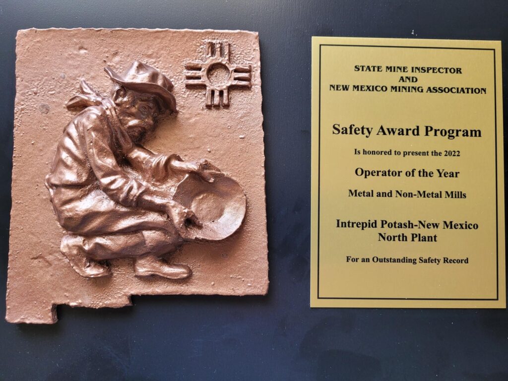 mine that has suffered a fire, cave-in, explosion, or other major disaster. Obviously, these conditions can’t just be created in our mine for the team to train in. We have to use designed scenarios that put our decision making and knowledge to the test, but are built to be performed in an open area like a parking lot, or even inside a large open space. The team must test for smoke/gasses as they enter “the mine”, precisely map all conditions that they encounter (i.e. cave ins, water, evidence of fire, damage, and any miners living or deceased). When living miners are encountered, the team uses their first aid skills and assesses the patient’s injuries and their ability or inability to walk out of the mine. Incapacitated and unconscious miners are properly packaged and placed in a stretcher basket and carried out. These practices are very difficult, because you are essentially pretending to encounter all of these things. MSHA has created competition style events that that test all of these skills. These contest are typically held at numerous regional events around the nation each year. There is no set requirement for companies to attend any of these events, but Intrepid sees the value in sending our team to one or two of these contests each year. The competitive nature of putting your skills, knowledge, and problem-solving up against teams from other mining companies has a great driving effect to create a desire to study, practice, and remain involved. Every other year, there is a National Mine Rescue Competition held in different parts of the country. Teams from companies all over the United States gather to see who is the best of the best in a number of different categories. August 9-11, 2022, the mine rescue team from Intrepid traveled to Lexington, Kentucky for the very purpose. Twenty-two other teams from Metal/Non-Metal mines were in attendance. While there are a few different categories, the most sought after and desired is the Mine Rescue Field Competition, which is a scenario as described above. To begin the day, the team of 7 sat for a test of their knowledge, and did very well which resulted in 6 discounts for their combined score. Next, the team competes in the field scenario and does so as if they are entering a real mine. 5 team members must wear the SCBA breathing apparatus and travel through the problem. Two members remain outside the mine and communicate with the team in the mine and must map everything the team encounters. The team encountered fallen ground, explosives gasses, damaged electrical equipment, numerous victims, and they were required to ventilate the mine with fresh air for the trapped miners, while avoiding blowing the explosives gases over any ignition sources. The team did the problem perfectly with zero discounts and was able to do so in a very speedy time of 75 minutes for the 90 minute designed problem. The maps are then graded for accuracy and content. The maps had discounts of 11 points. So all together the team finished the problem with an amazing 17 discounts. When all the teams competed, the final totals put Intrepid in third place for the field contest. The difference in scoring from 1st place to 3 place was on 13 points. In the combined scoring, which includes First-Aid, and Tech (Gas Instrument and Ventilation), and the Field; Intrepid was able to capture 5th place.